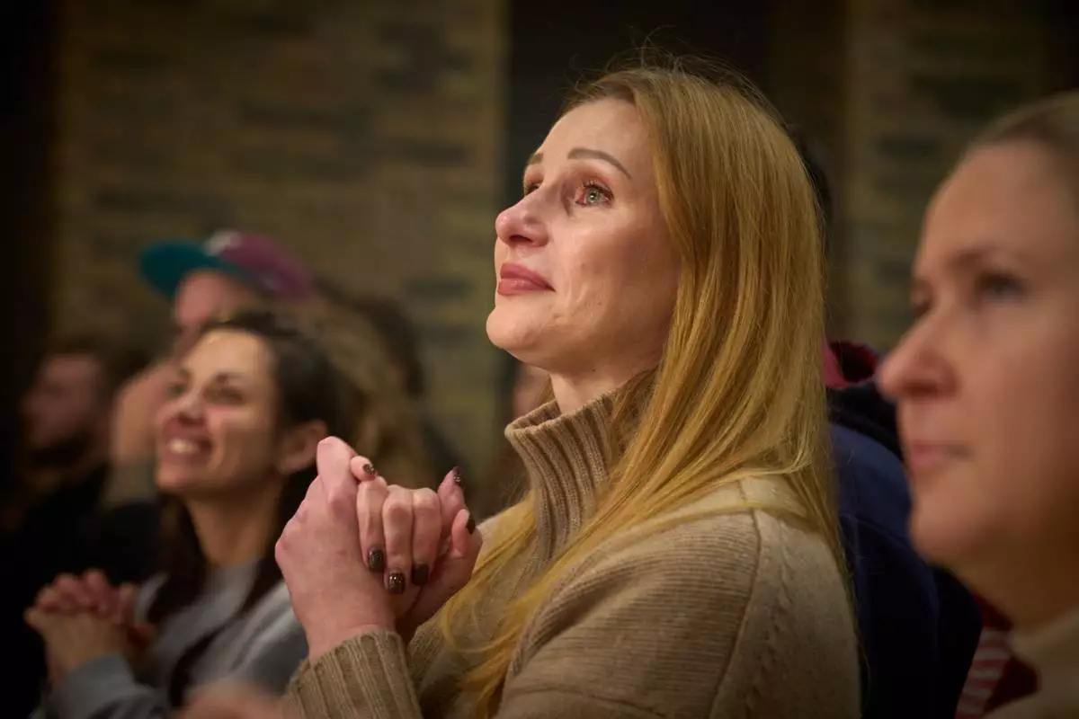 Viewers react to the premiere of an adaptation of Ivan Kotliarevskyi’s “Eneida,” a Ukrainian reimagining of Virgil’s “Aeneid,” performed by war veterans, many of whom sustained severe injuries in combat during Russia's full-scale invasion of Ukraine, in Kyiv, Ukraine, Thursday, Feb. 19, 2026. (AP Photo/Efrem Lukatsky)