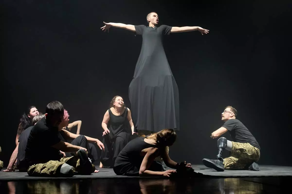 Ukrainian war veterans, many of whom sustained severe injuries in combat during Russia's full-scale invasion of Ukraine, perform during a premiere on Thursday, Feb. 19, 2026, in Kyiv, Ukraine. (AP Photo/Efrem Lukatsky)