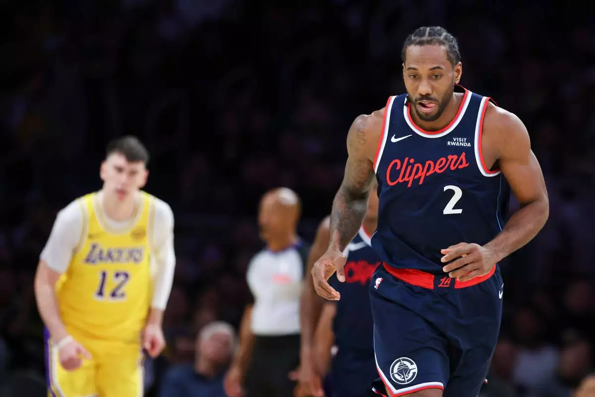 Los Angeles Clippers forward Kawhi Leonard (2) reacts after scoring as Los Angeles Lakers forward Jake LaRavia (12) watches during the first half of an NBA basketball game, Friday, Feb. 20, 2026, in Los Angeles. (AP Photo/Jessie Alcheh)