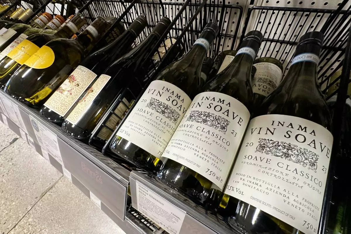 FILE - Italian bottles of white wines are dispalyed at a liquor store in Niles, Ill., Thursday, March 13, 2025. (AP Photo/Nam Y. Huh, File)