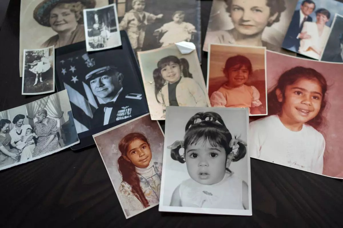 FILE - Childhood photos of a woman adopted as a toddler by an American war veteran, who he found in the 1970s in an Iranian orphanage and raised as a Christian, are displayed along with a picture of her father, a WWII Air Force veteran, at left, and additional family photos, Monday, June 24, 2024, in Henderson, Nev. (AP Photo/David Goldman, File)