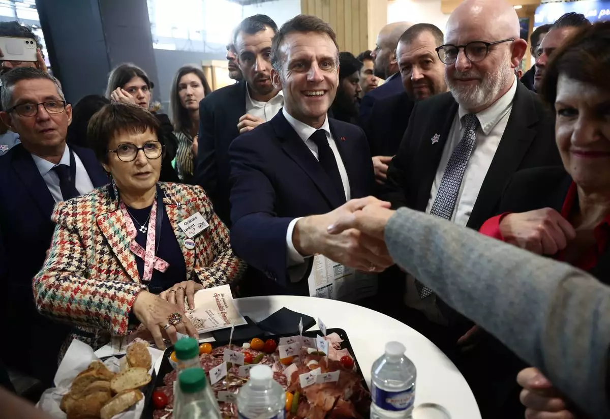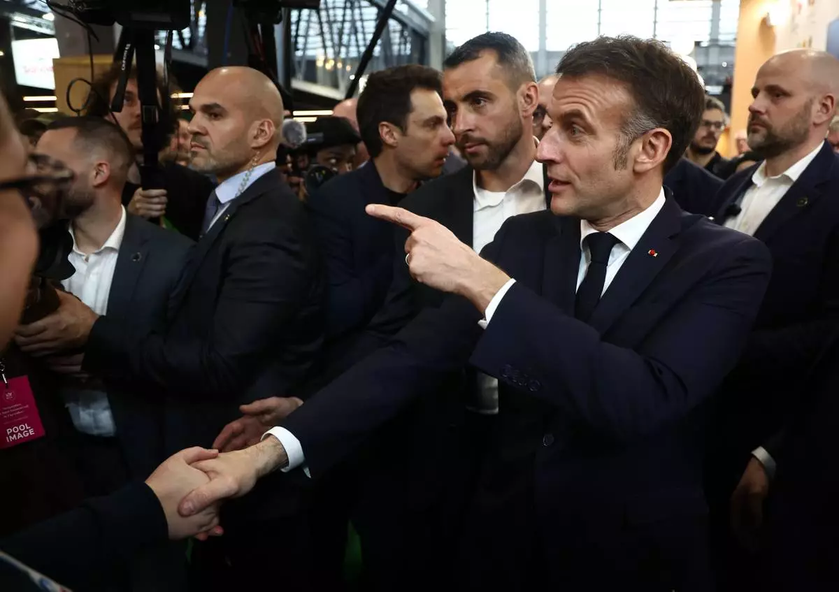 French President Emmanuel Macron attends the International Agriculture Fair during the opening day in Paris, Saturday, Feb. 21, 2026. (Christophe Petit Tesson/Pool Photo via AP)