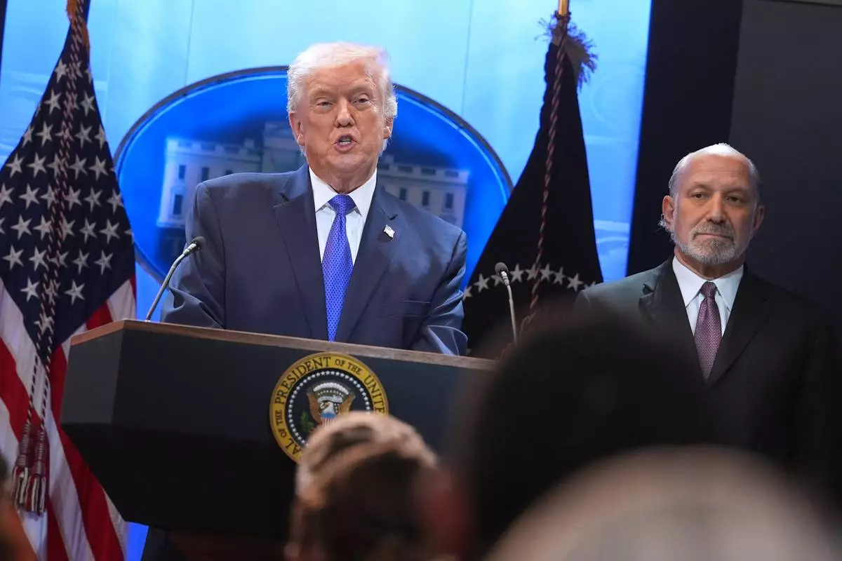 President Donald Trump speaks during a press briefing at the White House, Friday, Feb. 20, 2026, in Washington, as Commerce Secretary Howard Lutnik, looks on. (AP Photo/Evan Vucci)
