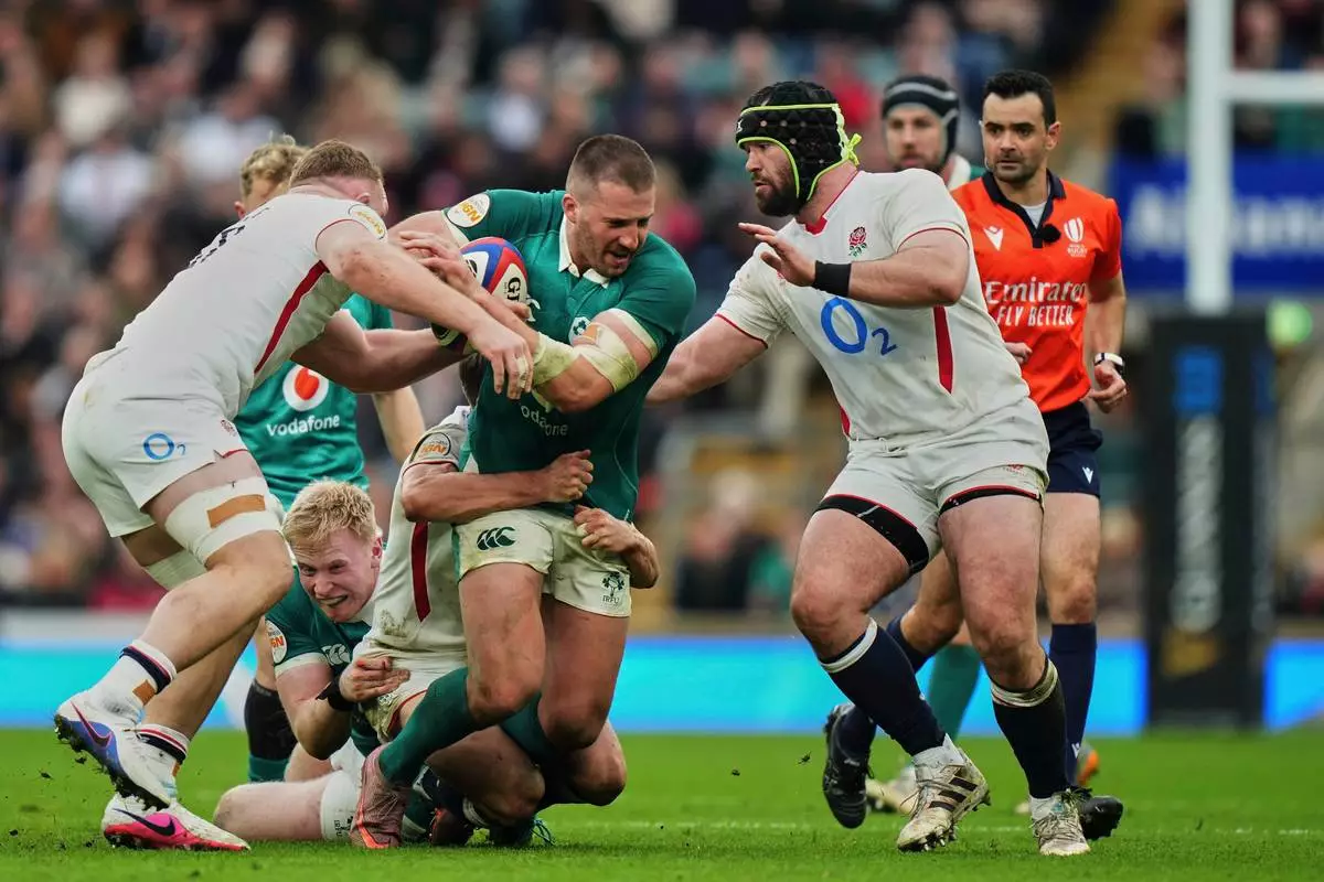 Ireland's Stuart McCloskey, center, is tackled from behind during the Six Nations rugby union match between England and Ireland in London, England, Saturday, Feb. 21, 2026. (AP Photo/Alastair Grant)