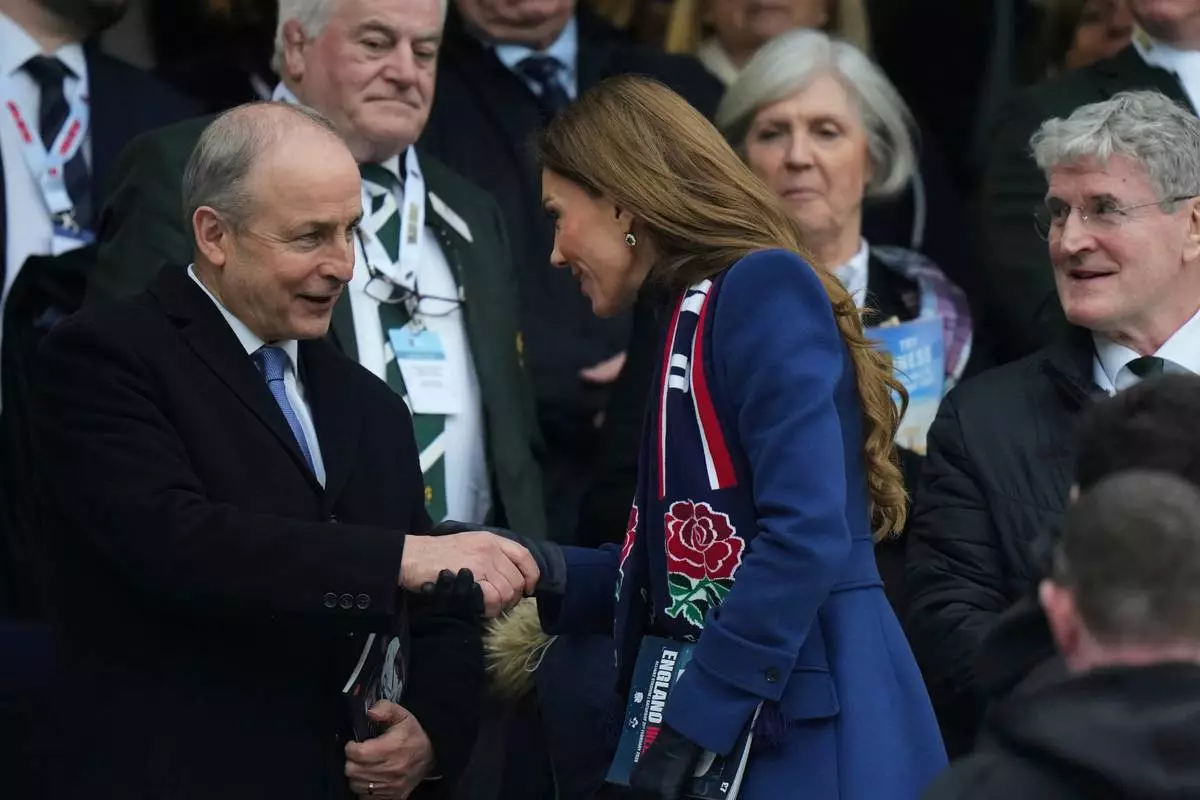 Britain's Kate, Princess of Wales, center, shakes hand with Irish Prime Minister Micheal Martin following the Six Nations rugby union match between England and Ireland in London, England, Saturday, Feb. 21, 2026. (AP Photo/Alastair Grant)