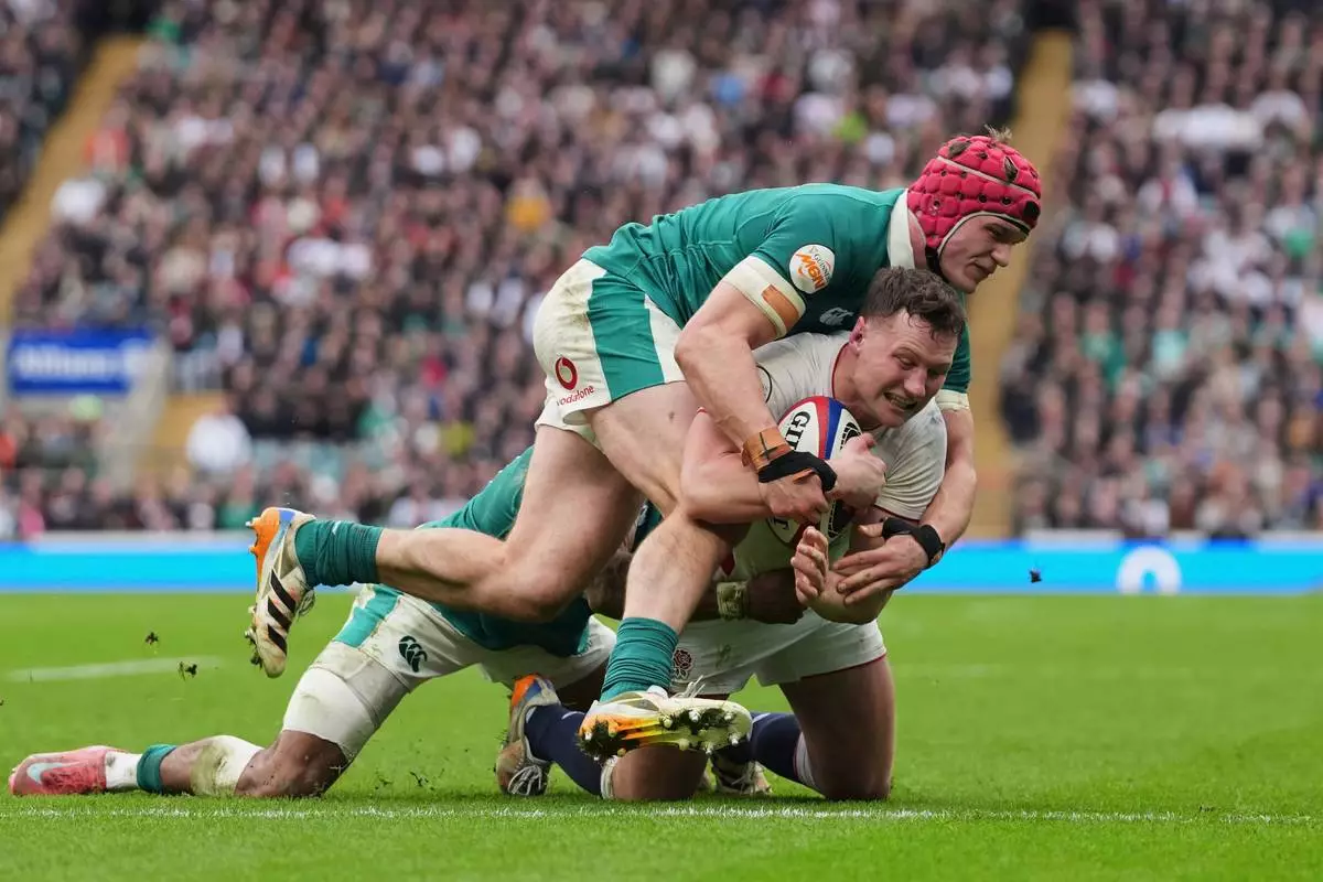 England's Fraser Dingwall, right, scores a try as Ireland's Joe McCarthy tries to tackle him during the Six Nations rugby union match between England and Ireland in London, England, Saturday, Feb. 21, 2026. (AP Photo/Alastair Grant)
