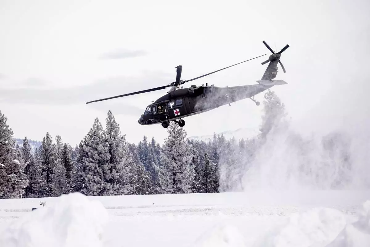 A U.S. Army Blackhawk helicopter lifts off on a mission to recover skiers who died during an avalanche, in Truckee, Calif., Saturday, Feb. 21, 2026. (Stephen Lam/San Francisco Chronicle via AP)