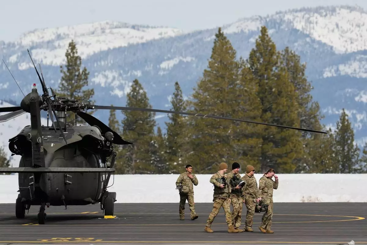 U.S. Army soldiers exit a Black Hawk at the Truckee Tahoe Airport in Truckee, Calif., Saturday, Feb. 21, 2026, after aiding in recovery efforts for a group of skiers who went missing during a deadly avalanche. (AP Photo/Godofredo A. Vásquez)