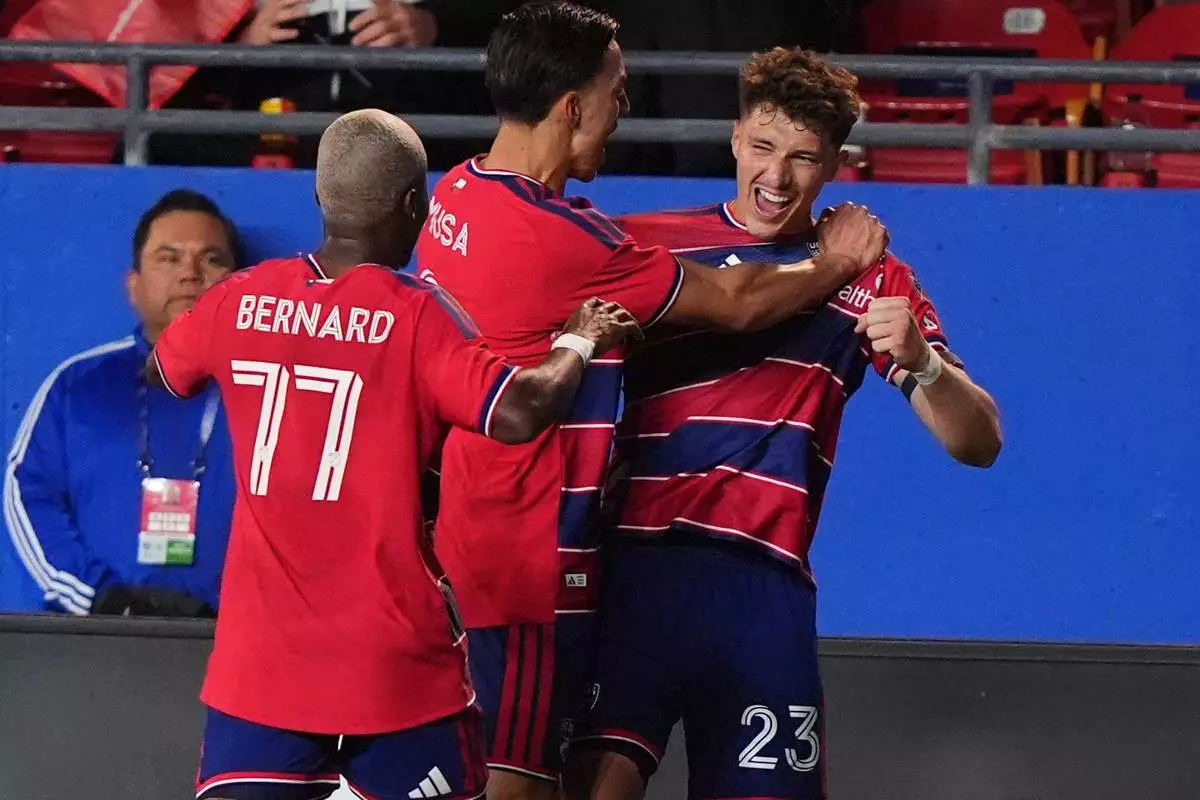 FC Dallas forward Logan Farrington (23) celebrates after his goal with forward Petar Musa, center, and forward Bernard Kamungo (77) during the first half of an MLS soccer match against Toronto FC in Frisco, Texas, Saturday, Feb. 21, 2026. (AP Photo/LM Otero)