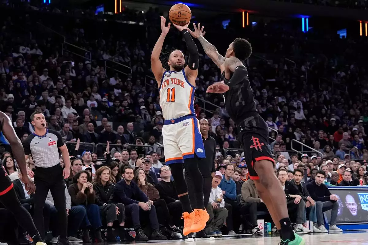 New York Knicks guard Jalen Brunson (11) shoots over Houston Rockets forward Jabari Smith Jr. (10) during the second half of an NBA basketball game, Saturday, Feb. 21, 2026, in New York. (AP Photo/Yuki Iwamura)