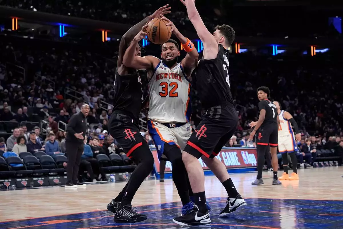 New York Knicks center Karl-Anthony Towns (32) drives past Houston Rockets forward Tari Eason (17) and Houston Rockets center Alperen Sengun (28) during the second half of an NBA basketball game, Saturday, Feb. 21, 2026, in New York. (AP Photo/Yuki Iwamura)