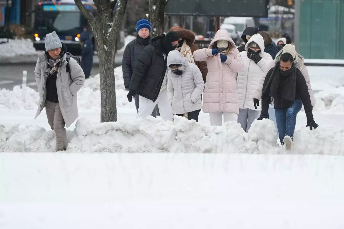 FILE - Pedestrians climb over snow banks to try and cross the streets in New York, Monday, Jan. 26, 2026. (AP Photo/Seth Wenig, File)