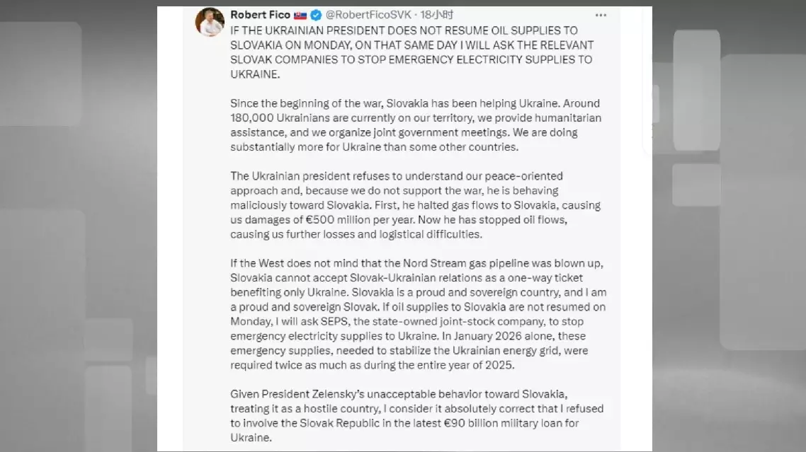 "If oil supplies to Slovakia are not restored on Monday, I will ask SEPS to stop emergency electricity supplies to Ukraine. In January 2026 alone, these emergency supplies needed to stabilize the Ukrainian energy grid were twice as high as for the whole of 2025," he posted on social media. SEPS is the Slovak state transmission system operator.