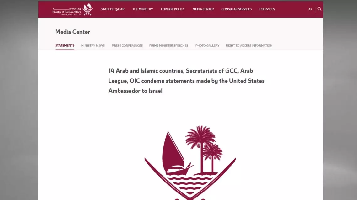 In the statement, the parties expressed strong condemnation of and profound concern over the ambassador's comments, which suggest that it would be acceptable for Israel to exercise control over territories belonging to Arab states, including the occupied West Bank.