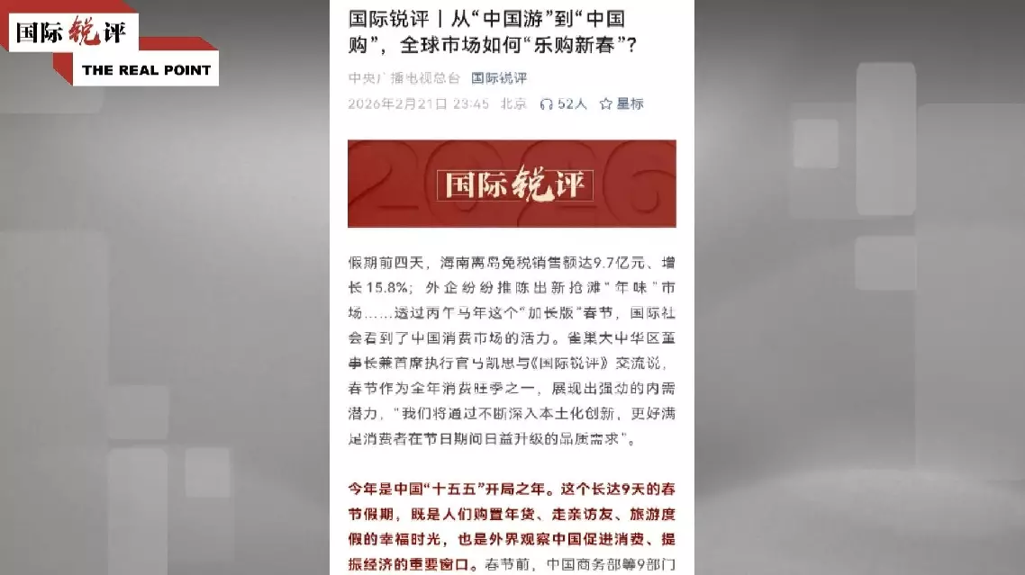 This year marks the beginning of China's 15th Five-Year Plan for national socioeconomic development in the 2026-2030 period. The official nine-day Spring Festival holiday is not only a happy time for people to purchase "nian huo," or New Year goods, visit relatives and friends and go outing in holiday making, but also an important window for the outside world to observe China's promotion of consumption and economic boost.