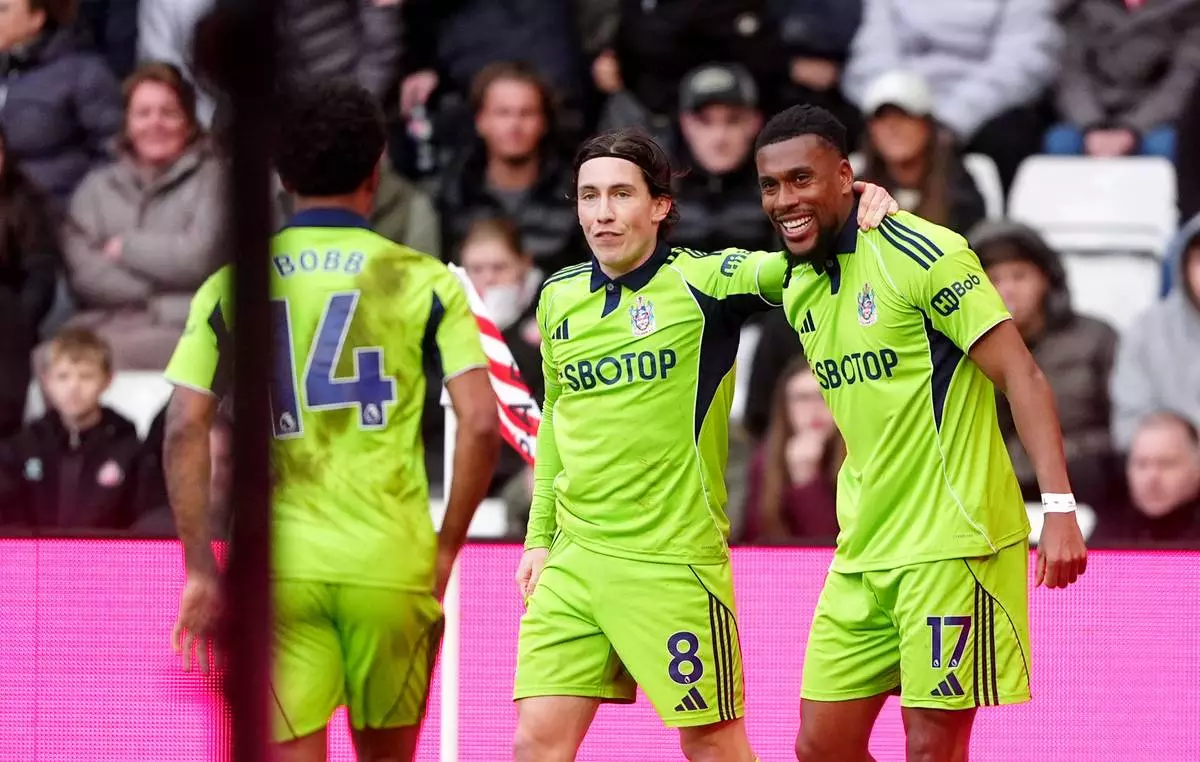 Fulham's Alex Iwobi, right, celebrates with his team mates after scoring his sides third goal during their English Premier League soccer match against Sunderland in Sunderland, England, Sunday, Feb. 22, 2026. (Owen Humphreys/PA via AP)