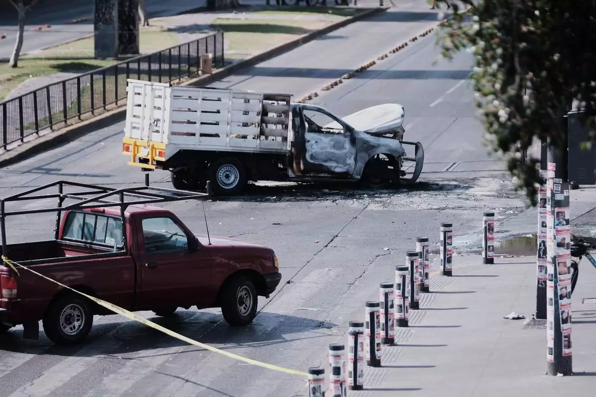 A vehicle sits charred after being set on fire, on a road in Guadalajara, Jalisco state, Mexico, Sunday, Feb. 22, 2026, after the death of the leader of the Jalisco New Generation Cartel, "El Mencho." (AP Photo/Alejandra Leyva)