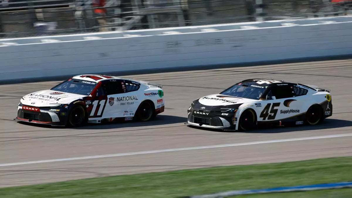 Denny Hamlin (11) and Tyler Reddick (45) head down the front straightaway during the third stage of a NASCAR Cup Series auto race at Kansas Speedway in Kansas City, Kan., Sunday, April 19, 2026. (AP Photo/Colin E. Braley)