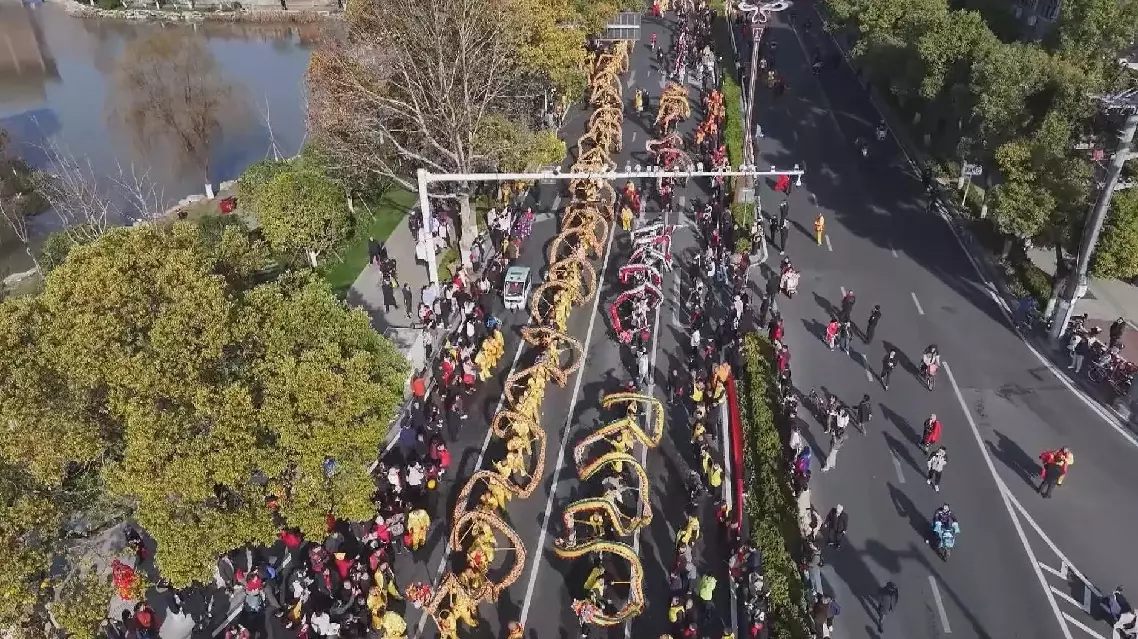 On Saturday, a grand dragon team was dancing, weaving through the main streets of Hubei's Huanggang City to perform for local residents who lined the streets.