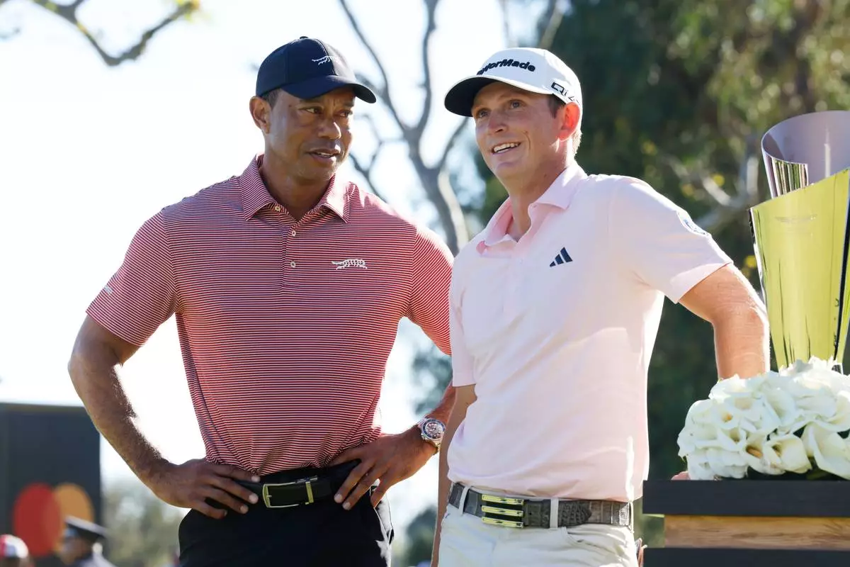Jacob Bridgeman, right, stands with Tiger Woods after winning the Genesis Invitational golf tournament at Riviera Country Club, Sunday, Feb. 22, 2026, in the Pacific Palisades area of Los Angeles. (AP Photo/Caroline Brehman )