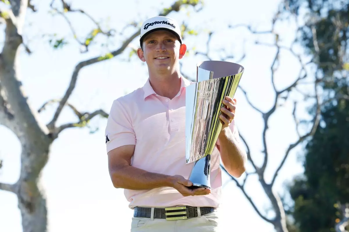 Jacob Bridgeman poses with the winner's trophy after winning the Genesis Invitational golf tournament at Riviera Country Club, Sunday, Feb. 22, 2026, in the Pacific Palisades area of Los Angeles. (AP Photo/Caroline Brehman)