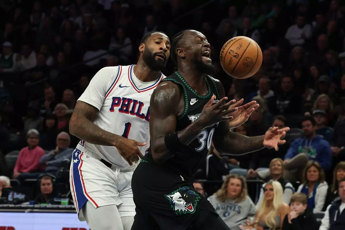 Minnesota Timberwolves forward Julius Randle (30) is fouled by Philadelphia 76ers center Andre Drummond (1) during the first half of an NBA basketball game Sunday, Feb. 22, 2026, in Minneapolis. (AP Photo/Stacy Bengs)