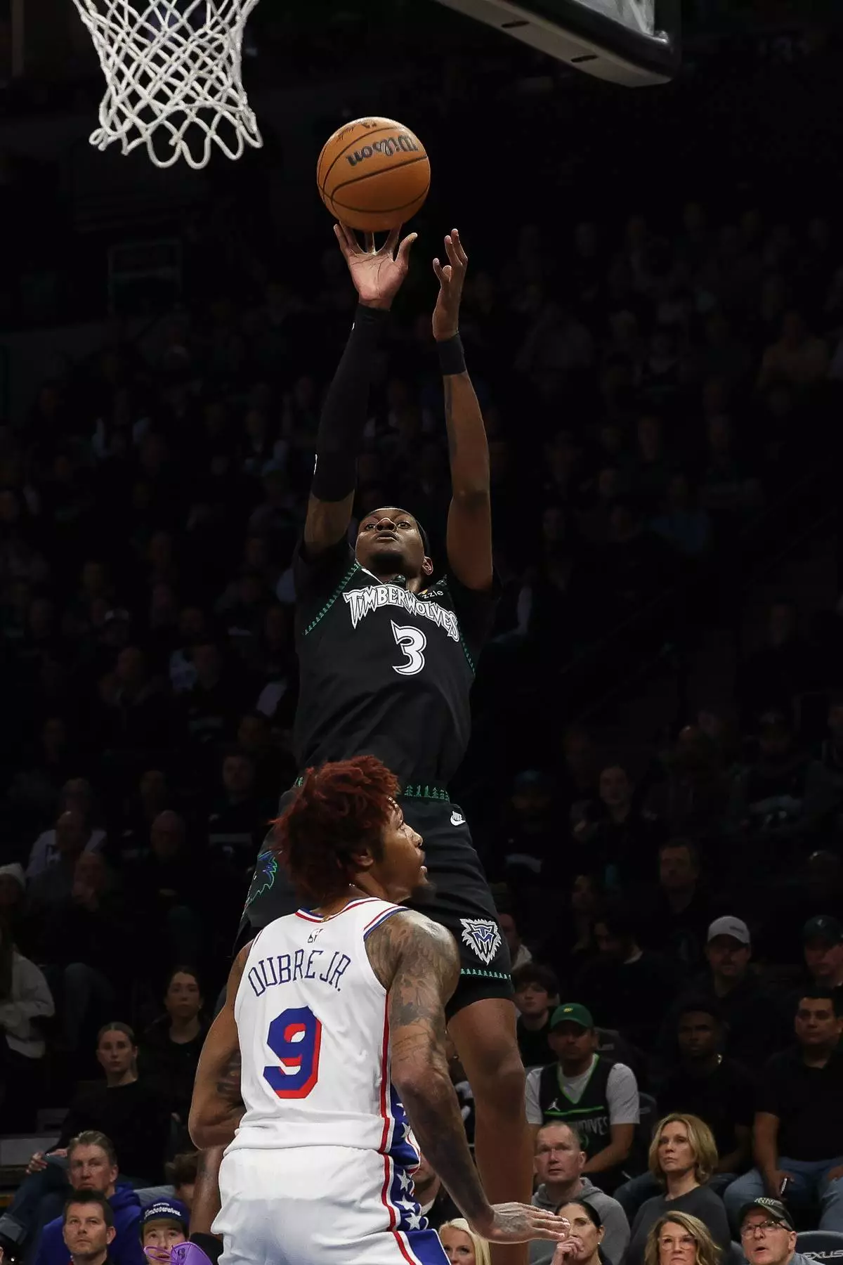 Minnesota Timberwolves guard Anthony Edwards (5) shoots the ball against Philadelphia 76ers guard Tyrese Maxey (0) during the first half of an NBA basketball game, Sunday, Feb. 22, 2026, in Minneapolis. (AP Photo/Stacy Bengs)