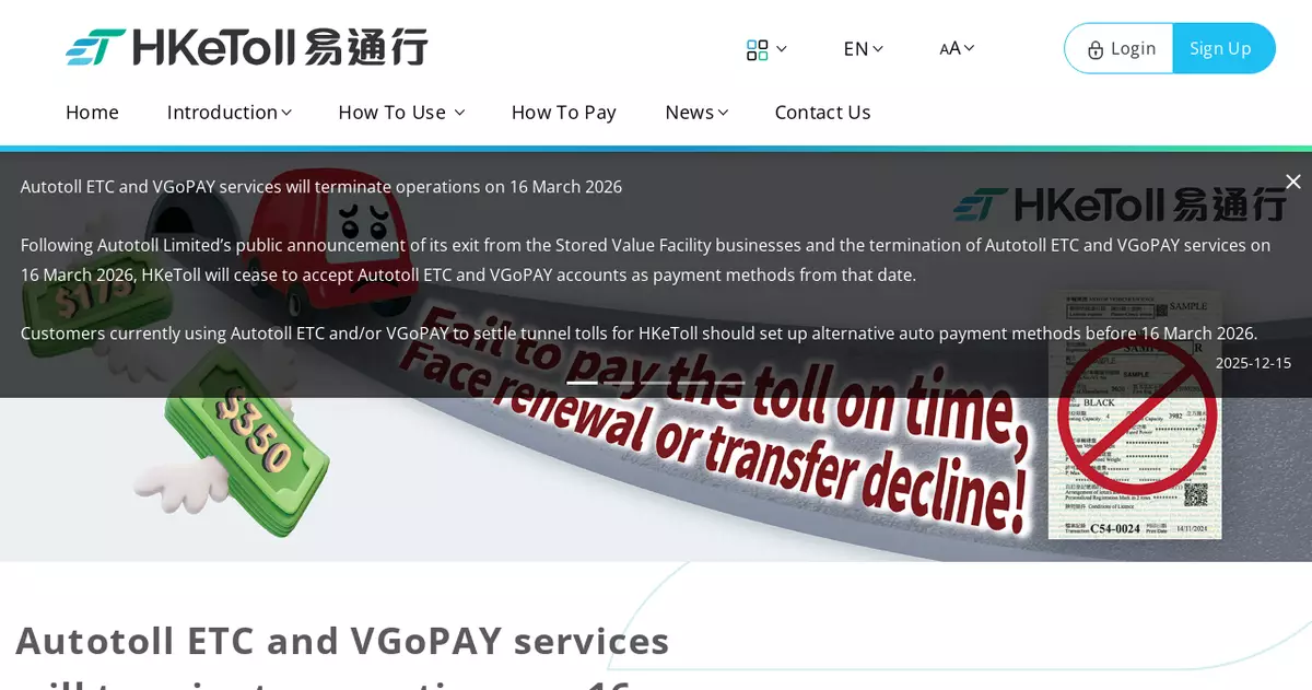 Since mid-December 2025, Autotoll Limited has notified users of the termination arrangements for Autotoll ETC and VGoPAY services via SMS, email and website (www.autotoll.com.hk/autotollclub/). In addition, the TD has instructed the HKeToll toll service provider to proactively remind Autotoll ETC and VGoPAY users in switching to other auto-payment means promptly to avoid disruption. Members of the public concerned will receive SMS messages sent by "#HKeToll" or emails from "do-not-reply1@hketoll.gov.hk" with steps on setting up auto-payment by linking a bank account or credit card, or direct debit from a Designated Stored Value Account (see details in Annexes) to pay tunnel tolls.