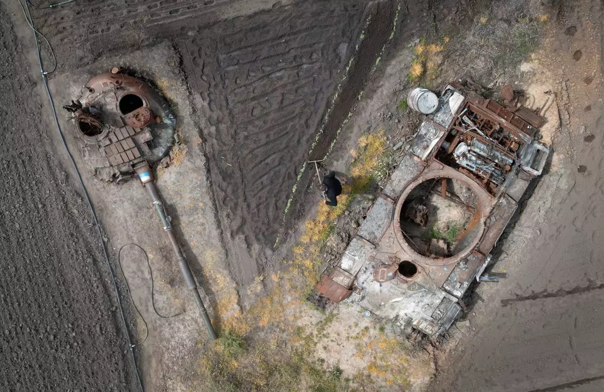 FILE - A peasant plants sunflowers in his garden between a damaged Russian tank and its turret in the village of Velyka Dymerka, Kyiv region, Ukraine, Wednesday, May 17, 2023. (AP Photo/Efrem Lukatsky, File)