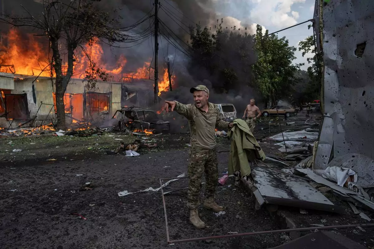 EDS NOTE: GRAPHIC CONTENT - FILE - A Ukrainian serviceman shouts to paramedics in front of the bodies of people killed after a Russian rocket attack on the food market in the city centrer of Kostiantynivka, Ukraine, Wednesday, Sept. 6, 2023. (AP Photo/Evgeniy Maloletka, File)