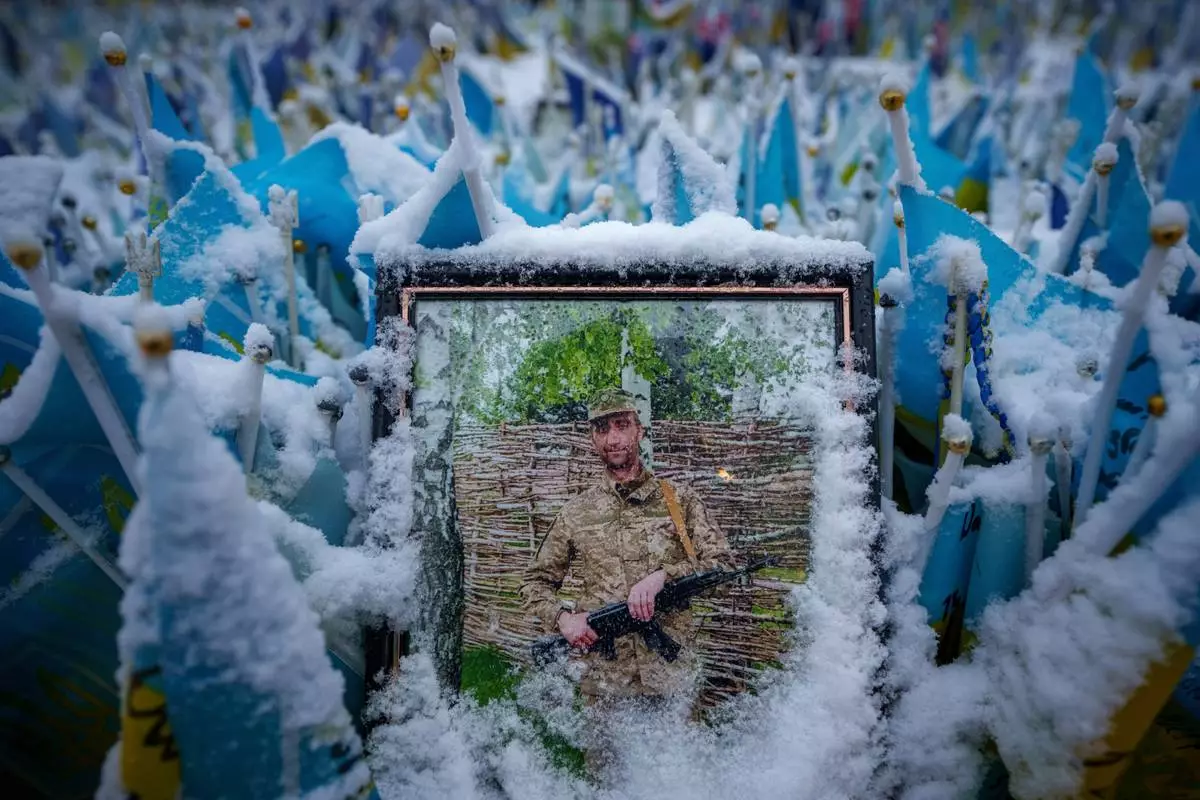 FILE - Snowflakes cover the photograph of a fallen Ukrainian serviceman in downtown Kyiv, Ukraine, Tuesday, March 12, 2024. (AP Photo/Vadim Ghirda, File)