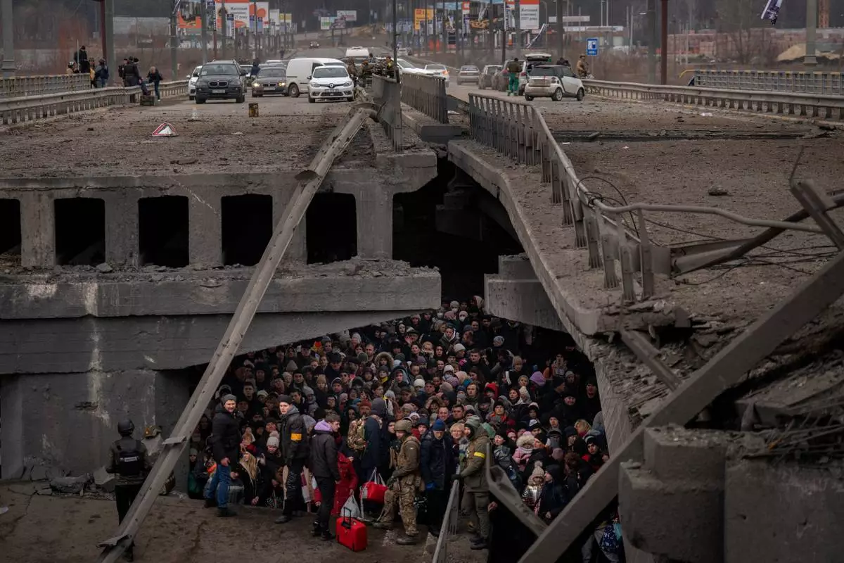 FILE - Ukrainians crowd under a destroyed bridge as they try to flee by crossing the Irpin River on the outskirts of Kyiv, Ukraine, Saturday, March 5, 2022. (AP Photo/Emilio Morenatti, File)