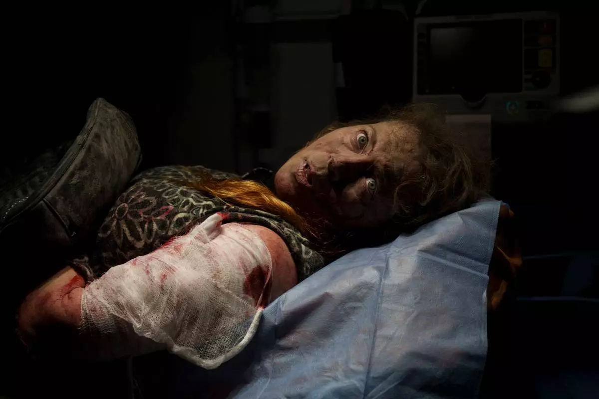 FILE - A resident wounded after a Russian attack, lies inside an ambulance before being taken to a hospital in Kherson, southern Ukraine, Thursday, Nov. 24, 2022. (AP Photo/Bernat Armangue, File)