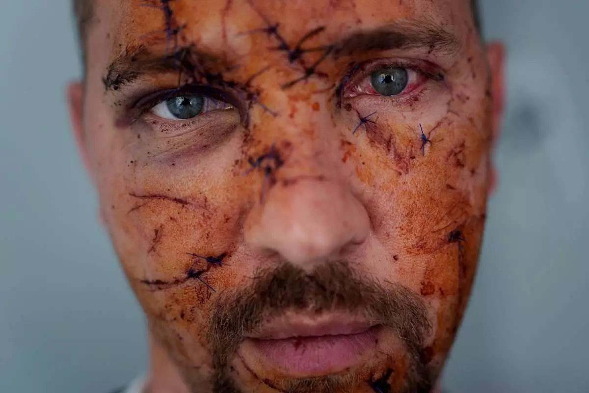 FILE - Multiple wounds cover the face of Kostiantyn Bychek after he was injured in a Russian strike on residential neighborhood, during a hospital visit in Kyiv, Ukraine, April 25, 2025. (AP Photo/Evgeniy Maloletka, File)