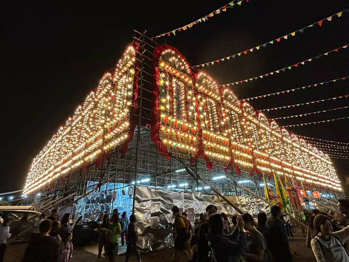 A giant bamboo altar, standing over 30 meters tall, was constructed for the Kam Tin Ten-Yearly Thanksgiving Festival and certified by Guinness World Records as the "world's largest temporary bamboo altar." As the festival drew to a close, the altar was transformed into a bamboo theater to host performances of Cantonese Opera for Deities during the Kam Tin Thanksgiving Celebration Carnival. The structure was meticulously brought to life by a team of scaffolding craftsmen led by Mr. Lai Zi Ming, who turned an empty space into a magnificent architectural marvel.