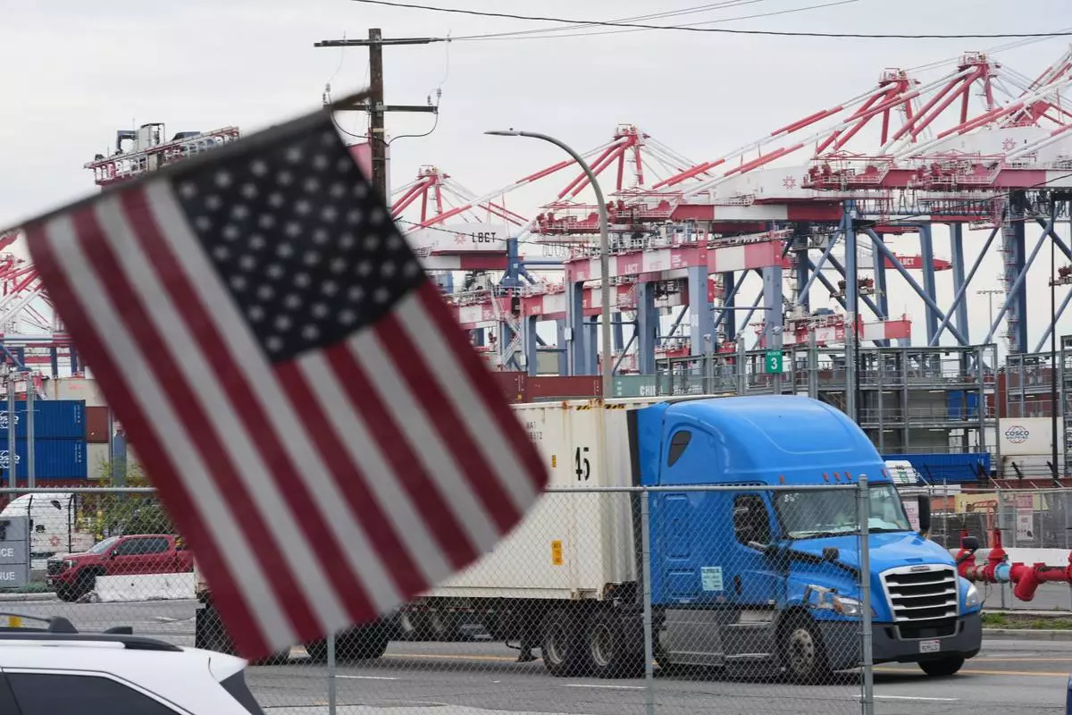 A U.S. flag files at the Port of Long Beach Friday, Feb. 20, 2026, in Long Beach, Calif. (AP Photo/Damian Dovarganes)