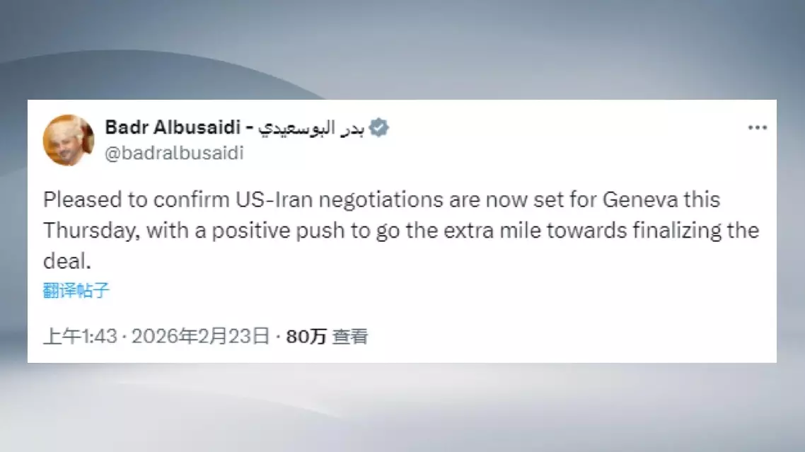 Omani Foreign Minister Sayyid Badr bin Hamad bin Hamood Albusaidi said on Sunday that the next round of U.S.-Iran talks will take place on Thursday in Geneva. "Pleased to confirm U.S.-Iran negotiations are now set for Geneva this Thursday, with a positive push to go the extra mile towards finalizing the deal," the minister said on social media platform X.