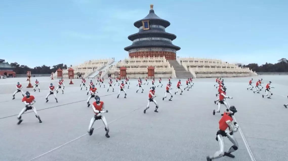 In a video released on Monday by Unitree, 50 humanoid robots in red vests assembled in front of the Hall of Prayer for Good Harvests, the main building at the Temple of Heaven, where they demonstrated their Kung Fu moves in perfect synchrony, such as backflipping, cartwheeling, and high-speed kickboxing.