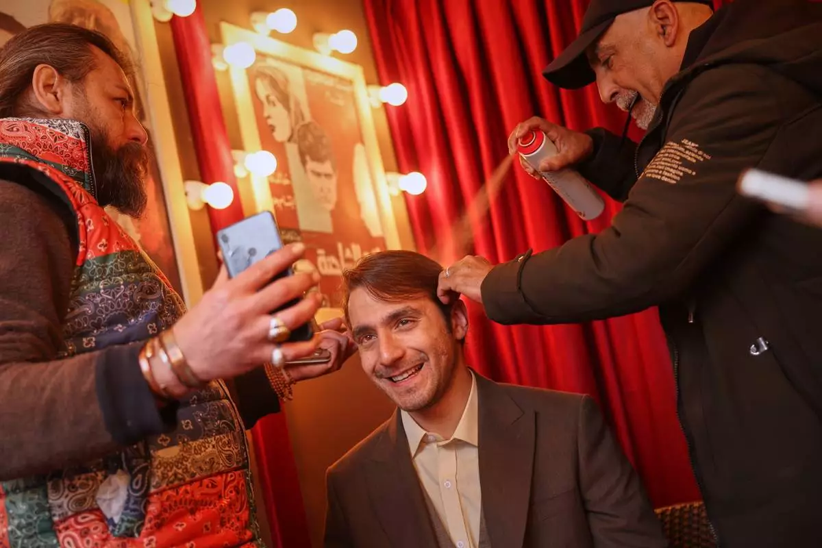 Actor Wissam Rida has his hair adjusted as he prepares to film a scene during the shooting of an episode of the TV series "Al-Souriyoun al-Aada" ("The Syrian Enemies"), based on a novel of the same name that was banned under Bashar Assad, in central Aleppo, Syria, Friday, Feb. 13, 2026. (AP Photo/Ghaith Alsayed)