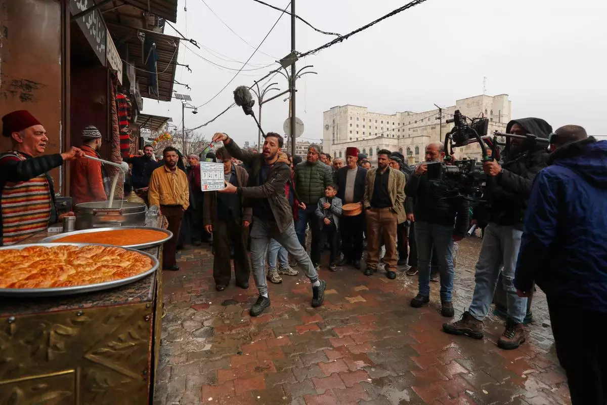 A television crew films an episode of the TV series "Al-Souriyoun al-Aada" ("The Syrian Enemies"), based on a novel of the same name that was banned under Bashar Assad, in central Aleppo, Syria, Friday, Feb. 13, 2026.(AP Photo/Omar Sanadiki)