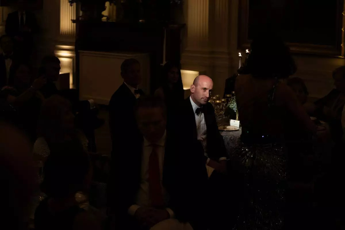 White House Deputy Chief of Staff Stephen Miller attends the National Governors Association dinner at the White House in Washington, on Saturday, Feb. 21, 2026. (AP Photo/Allison Robbert)