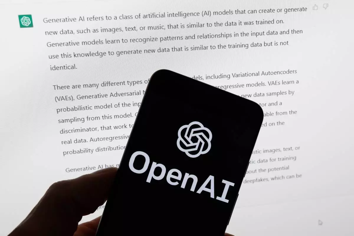FILE - The OpenAI logo is displayed on a mobile phone in front of a computer screen with output from ChatGPT, March 21, 2023, in Boston. (AP Photo/Michael Dwyer, File)