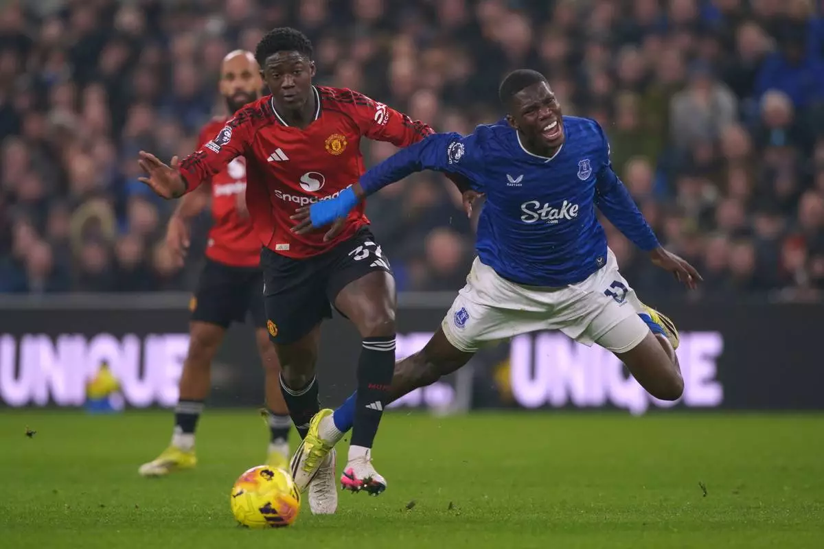 Manchester United's Kobbie Mainoo tackles Everton's Thierno Barry during the Premier League soccer match between Manchester United and Everton in Liverpool, England, Monday, Feb. 23, 2026. (AP Photo/Ian Hodgson)