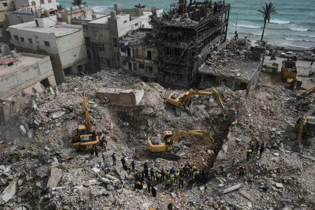Excavators remove rubble from destroyed buildings that were hit on Thursday by Israeli airstrikes, as they keep searching for victims in Tyre city, southern Lebanon, Saturday, April 18, 2026. (AP Photo/Bilal Hussein)