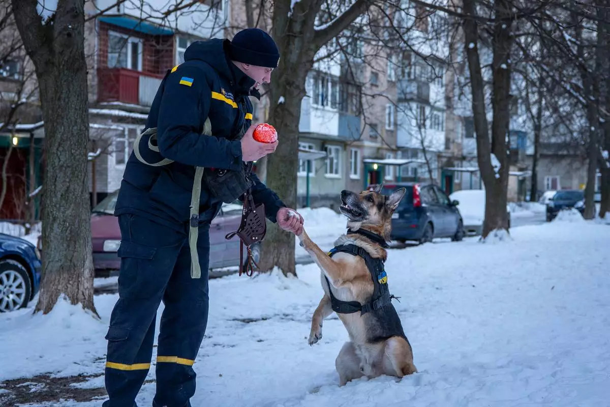 Ivan Khmelnytski, 25, a rescue worker, plays with his dog after work in Bila Tserkva, Ukraine, Saturday, Feb. 21, 2026. (AP Photo/Dan Bashakov)