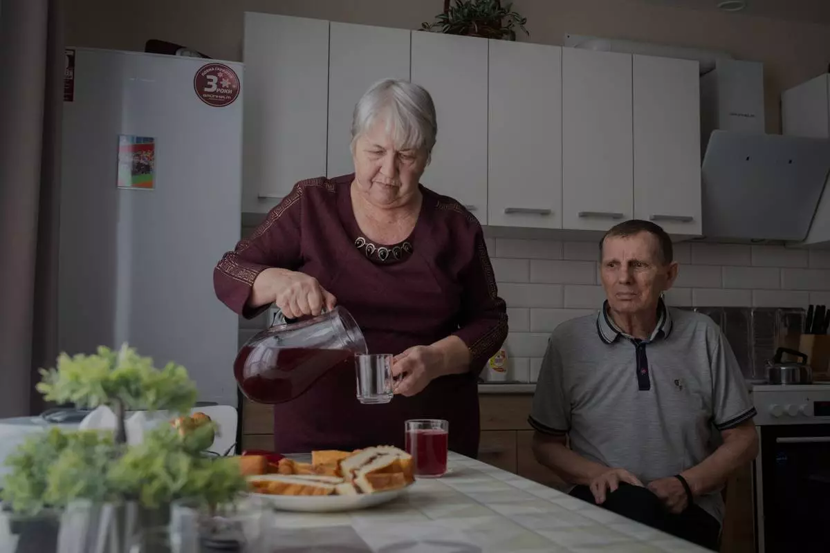 Liudmyla Shytik, 77, pours a drink for her husband Viktor, 78, in their social housing apartment in the Kyiv region of Ukraine, Wednesday, Feb. 18, 2026. (AP Photo/Efrem Lukatsky)