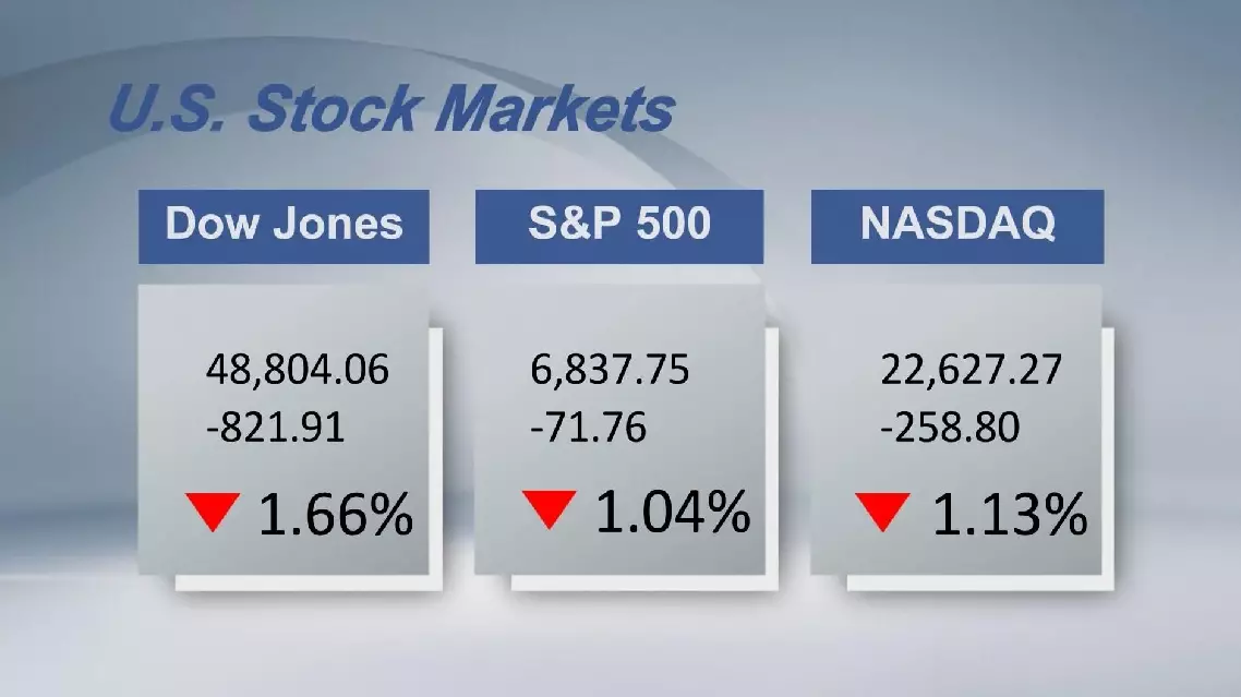 The Dow Jones Industrial Average fell 821.91 points, or 1.66 percent, to 48,804.06. The S and P 500 sank 71.76 points, or 1.04 percent, to 6,837.75. The Nasdaq Composite Index shed 258.8 points, or 1.13 percent, to 22,627.27.