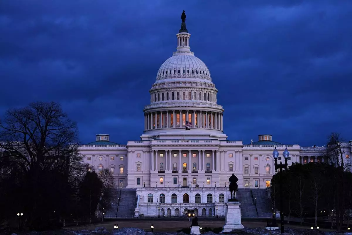 The U .S. Capitol is seen after sunset in Washington, Monday, Feb. 23, 2026, ahead of President Donald Trump's State of the Union address. (AP Photo/Matt Rourke)