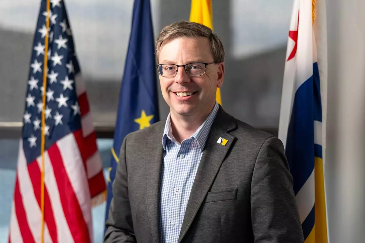 Mayor James Mueller poses for a portrait Thursday, Feb. 19, 2026, at City Hall in South Bend, Ind. (AP Photo/Michael Caterina)