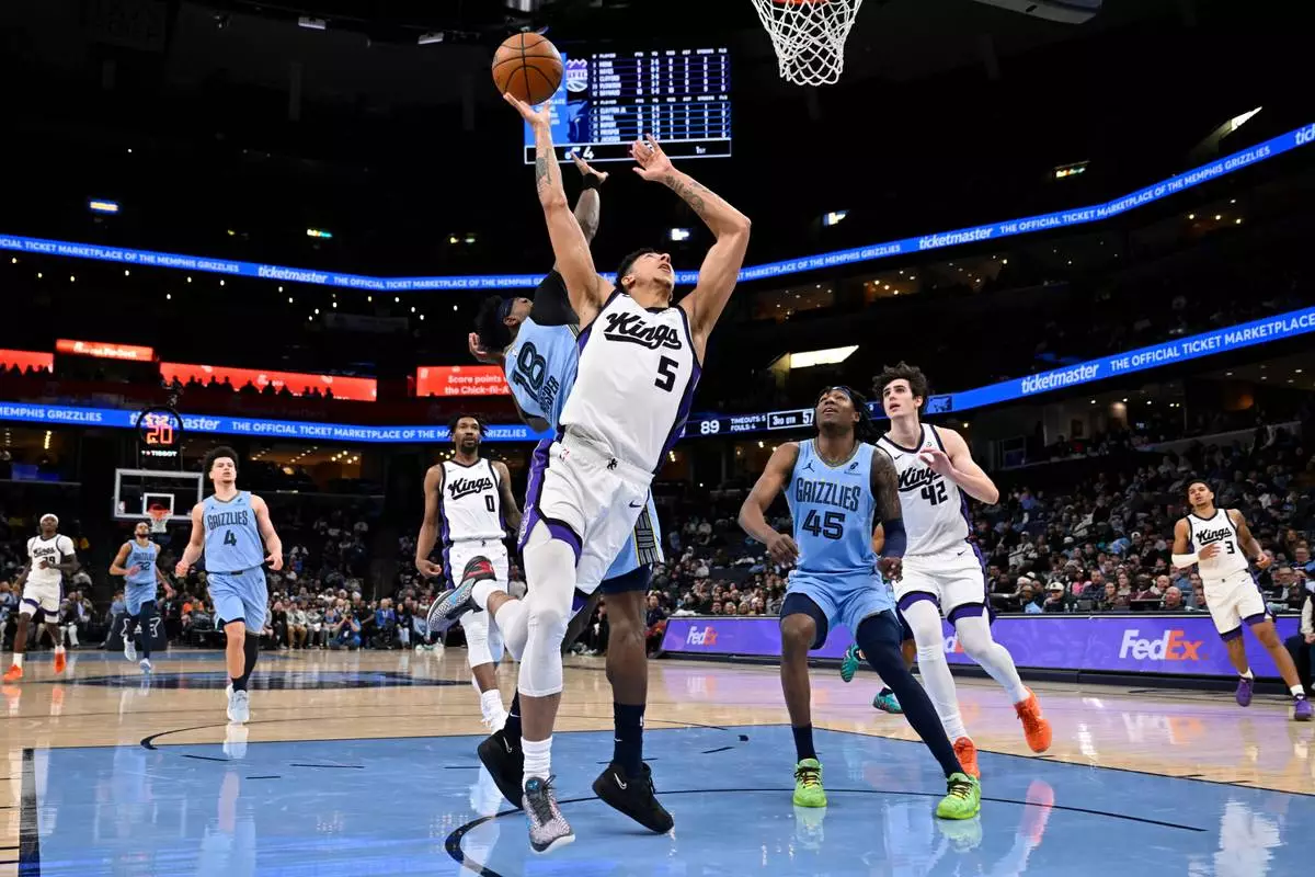 Sacramento Kings guard Nique Clifford (5) shoots against Memphis Grizzlies forward Olivier-Maxence Prosper (18) in the second half of an NBA basketball game, Monday, Feb. 23, 2026, in Memphis, Tenn. (AP Photo/Brandon Dill)